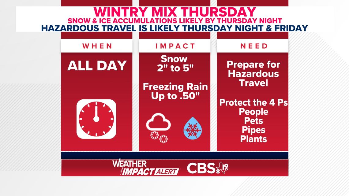 4:15AM – According to the National Weather Service, heavy mixed winter precipitation is expected to begin around midday on Thursday and last through Friday morning. Total snow accumulations between 2″-8″, mainly along and north of the I-30 corridor, and ice accumulations up to one quarter inch are expected in the warning area (pink shaded). Lesser amounts of snow and ice are expected farther south and east in the advisory area (purple shaded). Stay tuned for updates as the forecast may require adjustments to the warning and advisory areas.