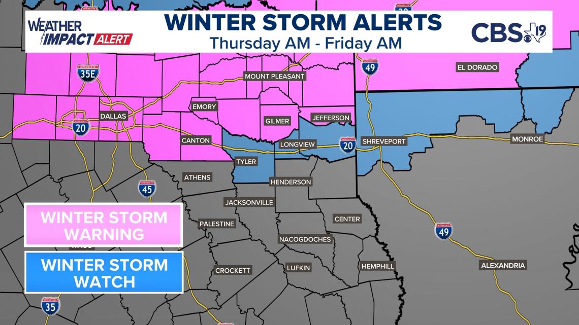 4:40AM – A Winter Storm Watch has been issued beginning at 6AM Thursday, Jan. 9, through noon on Friday, Jan. 10, for the following East Texas counties:
