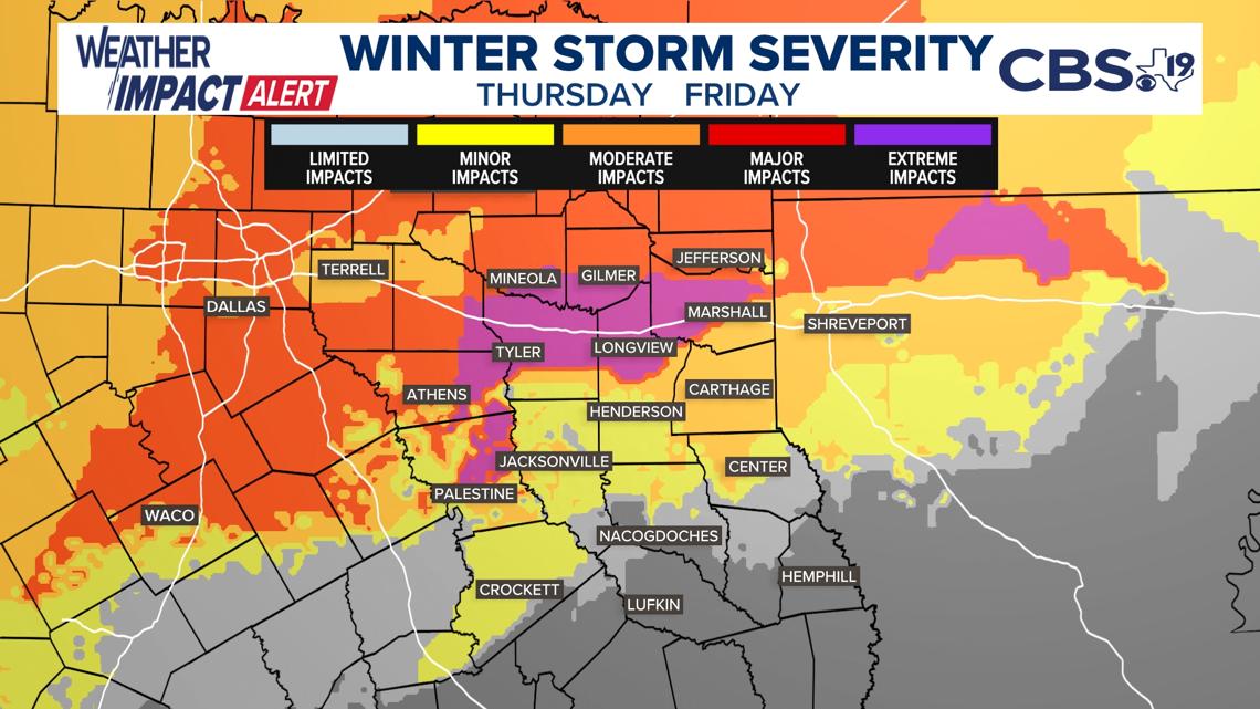 8AM – The Weather Prediction Center has upgraded their winter storm severity index for East Texas. Areas along I-20 are now in the “extreme impacts category.” This means extremely dangerous or impossible driving conditions and expansive and widespread closures are expected.